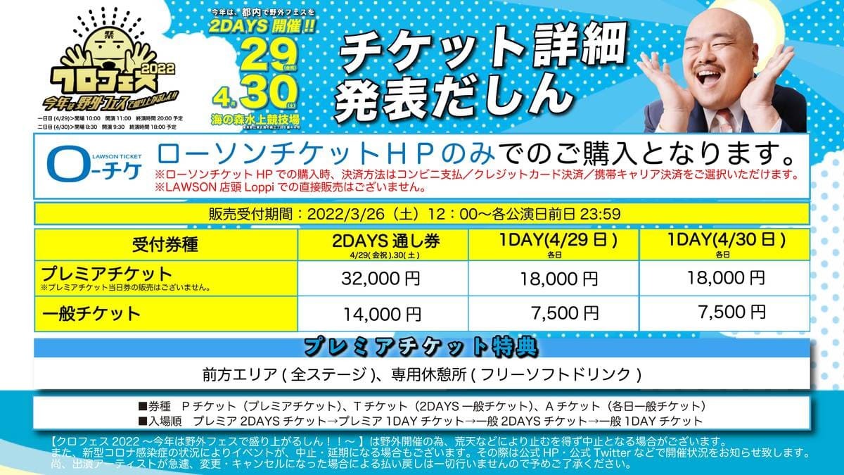 ■プレミアム2DAYS 32000円/プレミアム1DAY 14000円/一般2DAYS 18000円/一般1DAY 7500円