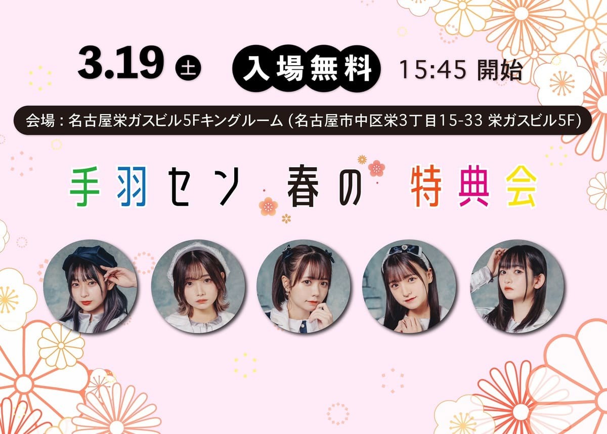 SCHEDULE BACK TO LIST 2022.3.19[Sat] 栄ガスビル5Fキングルーム 手羽セン春の特典会 【3/19】 『手羽セン春の特典会』 ■栄ガスビル5Fキングルーム ■入場無料 ■15:45開始 栄で特典会を開催します! ぜひお越しください! VENUE 栄ガスビル5Fキングルーム 愛知県名古屋市中区栄3丁目15-33栄ガスビル5F TIME 開場 / 未定 開演 / 15:45 TICKET ACT 手羽先センセーション