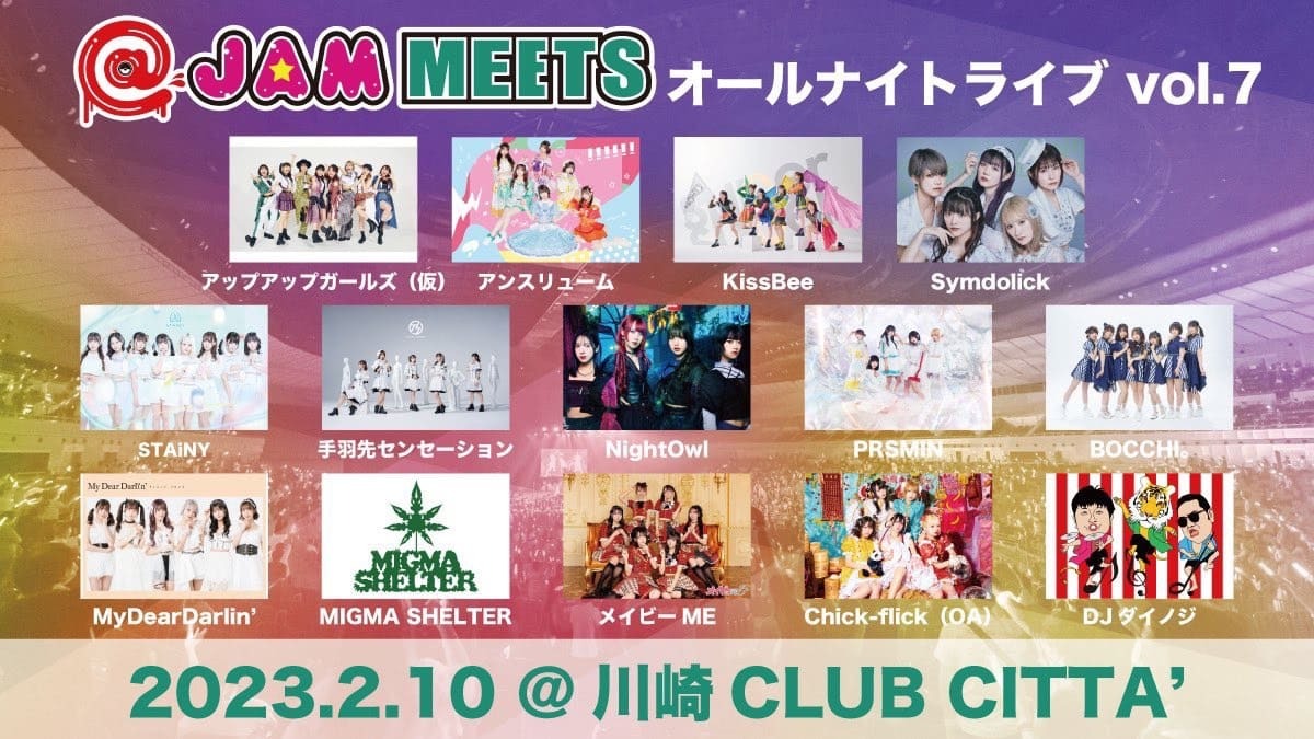 SCHEDULE BACK TO LIST 2023.2.10[Fri] 川崎 CLUB CITTA @JAM MEETS ~オールナイトライブ~vol.7 詳細→https://ticket.rakuten.co.jp/music/rtzpapd/ VENUE 川崎 CLUB CITTA [ URL ] 神奈川県川崎市川崎区小川町4-1 TIME 開場 / 23:30 開演 / 0:00 TICKET 前売 ¥ 4,200 / 当日 未定 ACT