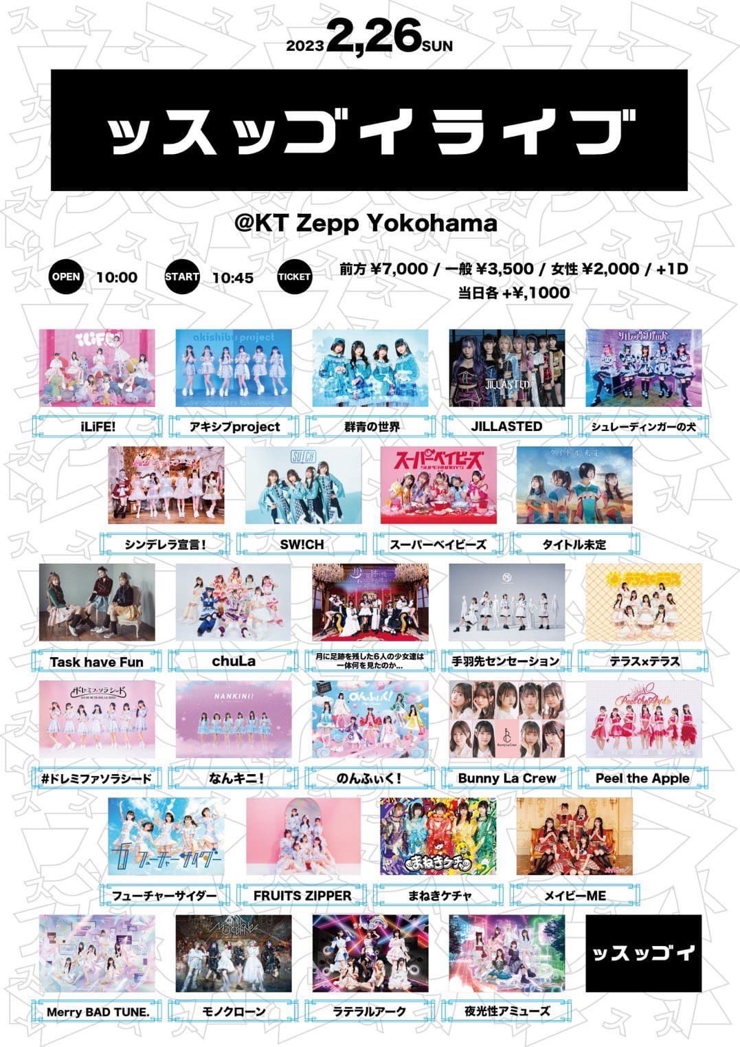 SCHEDULE BACK TO LIST 2023.2.26[Sun] KT Zepp Yokohama 『ッスッゴイライブ』 2/26】『ッスッゴイライブ』 ■KT Zepp Yokohama ■10:00開場/10:45開演 ■前方7000円/一般3500円/当日4000円/女性2000円 (+各1D) VENUE KT Zepp Yokohama 神奈川県横浜市西区みなとみらい4-3-6 TIME 開場 / 10:00 開演 / 10:45 TICKET 前売 ¥ 3,500 / 当日 ¥ 4,000 ACT