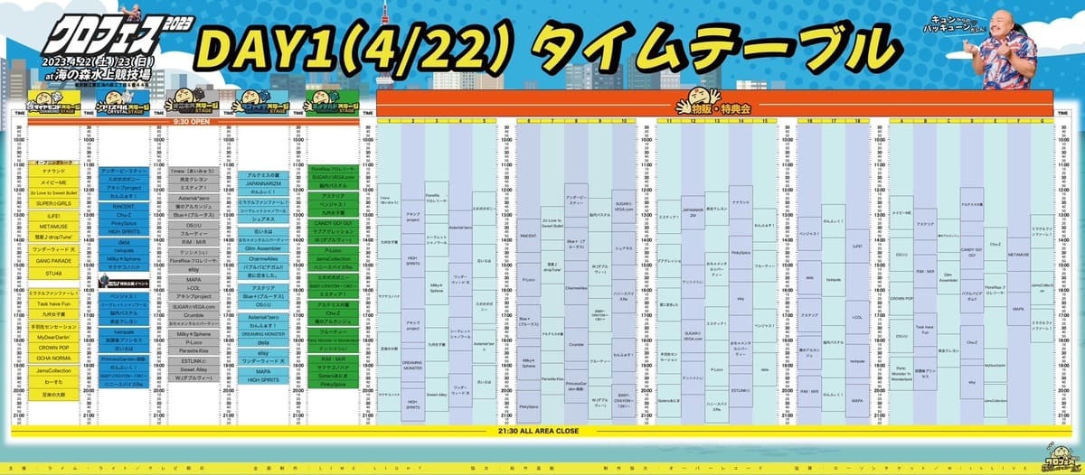 SCHEDULE BACK TO LIST 2023.4.22[Sat] 海の森水上競技場 クロフェス2023~野外フェスでキュンからのバッキューン♡だしん!!~ 【4/22-4/23】 『クロフェス2023~野外フェスでキュンからのバッキューン♡だしん!!~ 』 手羽センは4/22(土)、4/23(日)両日出演!! VENUE 海の森水上競技場 [ URL ] 東京都江東区海の森三丁目6番44号 TIME 開場 / 未定 開演 / 未定 TICKET 前売 未定 / 当日 未定 ACT