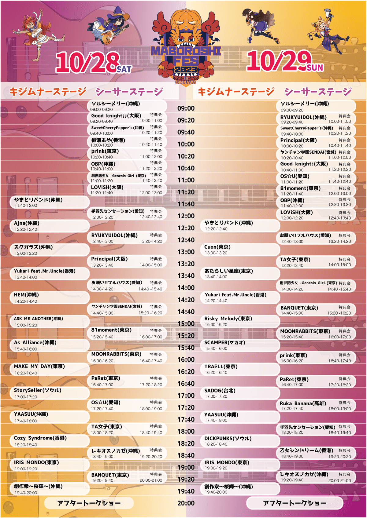 SCHEDULE BACK TO LIST 2023.10.28[Sat] NAHA BEACH RESORT(波の上うみそら公園) MABOROSHI FES 2023 【10/28-29】『MABOROSHI FES 2023』 1日目 VENUE NAHA BEACH RESORT(波の上うみそら公園) [ URL ] 沖縄県那覇市若狭1-25-11 TIME 開場 / 8:30 開演 / 9:00 TICKET 前売 ¥ 2,000 / 当日 未定 ACT