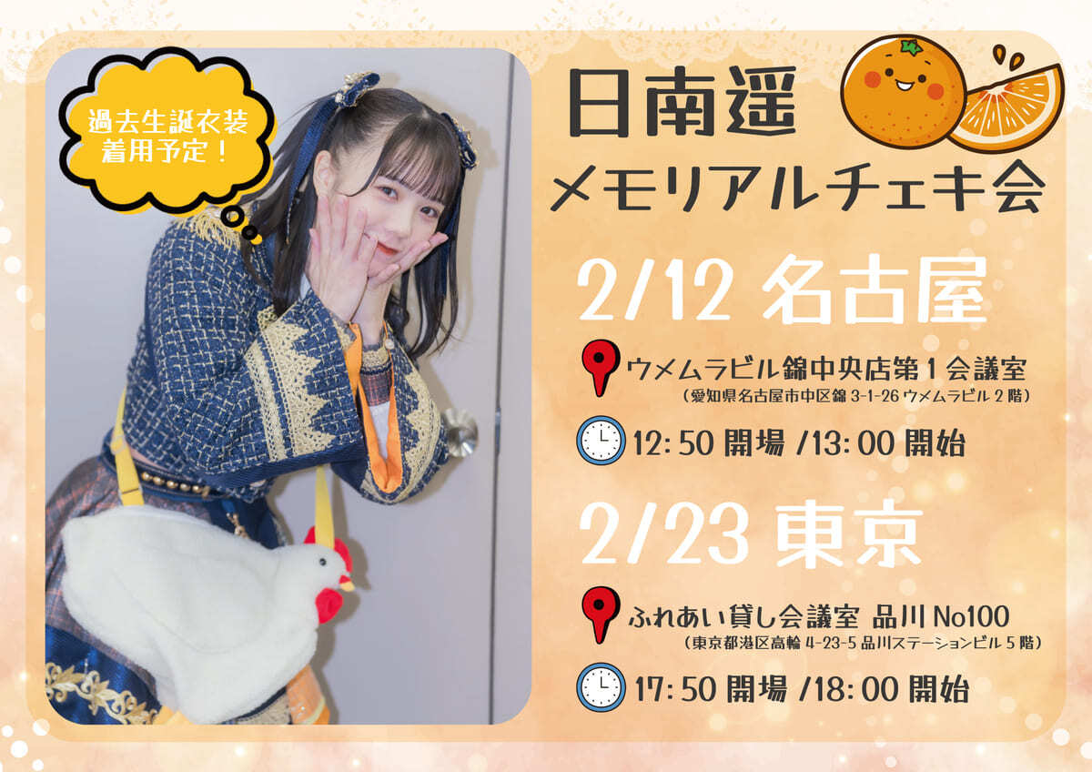 SCHEDULE BACK TO LIST 2024.2.23[Fri] ふれあい貸会議室 品川No100 日南遥メモリアルチェキ会 日南遥単独チェキ会開催決定 過去生誕衣装着用予定 2/23(金) 東京 ■ふれあい貸会議室 品川No100 (東京都港区高輪4-23-5品川ステーションビル5階) ■17:50開場/18:00開始 ■入場無料 ※予約不要 VENUE ふれあい貸会議室 品川No100 東京都港区高輪4-23-5品川ステーションビル5階 TIME 開場 / 17:50 開演 / 18:00 TICKET 前売 未定 / 当日 未定 ACT