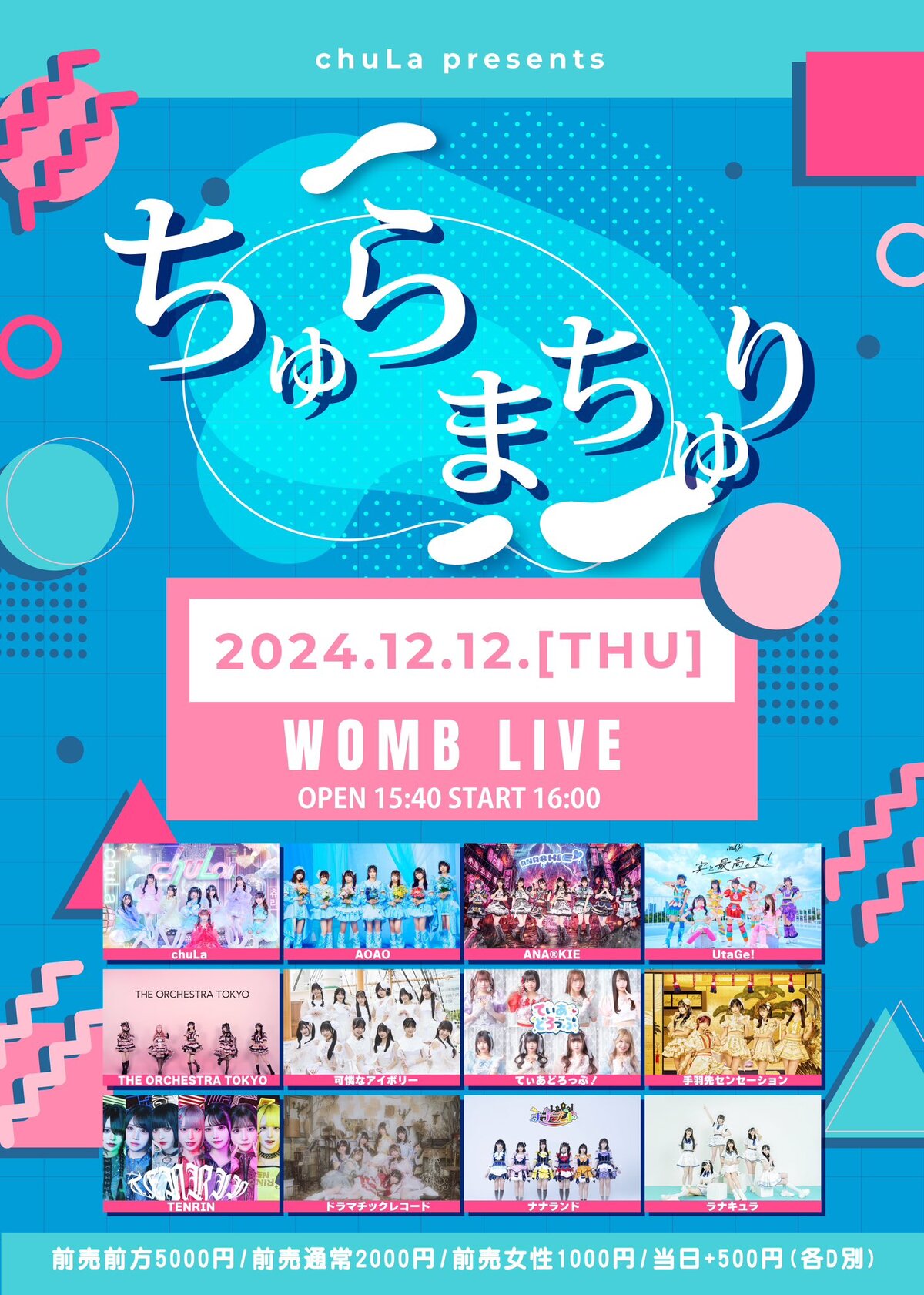 SCHEDULE BACK TO LIST 2024.12.12[Thu] WOMB LIVE ちゅらまちゅり ・日程:2024/12/12(木) ・イベント名:ちゅらまちゅり ・料金:前売前方5000円/前売通常2000円/前売女性1000円/当日+500円(各D別) ノーマルチェキ ・開場日時:15:40 開演日時:16:00 ・チケットサイト:ticketdive.com/event/vhuramatyuri1212 ※11/6 20:00〜販売開始 ・出演時間 ライブ:18:25-18:50 特典会:19:20-20:30(A) VENUE WOMB LIVE 東京都渋谷区 TIME 開場 / 15:40 開演 / 16:00 TICKET 前売 未定 / 当日 未定 ACT