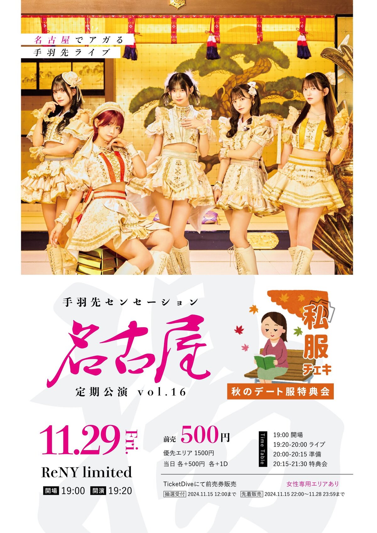 SCHEDULE BACK TO LIST 2024.11.29[Fri] ReNY limited 名古屋定期公演vol.16 ・日程:2024/11/29(金) ・イベント名:名古屋定期公演vol.16 ・料金:優先エリア1500円/前売500円/当日各+500円(各+1D) ・開場日時:19:00 開演日時:19:20 ・チケットサイト:t-dv.com/nagoya_16 ①先行抽選販売~2024.11.15(金)12:00まで ②先着販売 2024.11.15(金) 22:00~11.28(木)23:59まで ・出演時間 VENUE ReNY limited 愛知県名古屋市中区 TIME 開場 / 19:00 開演 / 19:20 TICKET 前売 未定 / 当日 未定 ACT