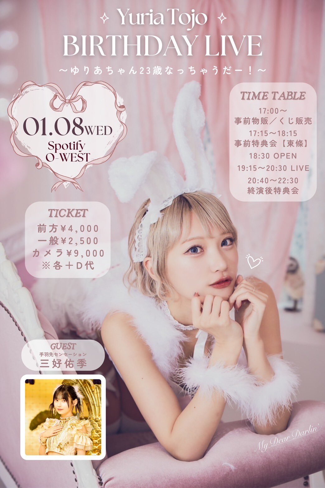 SCHEDULE BACK TO LIST 2025.1.8[Wed] Spotify O-WEST Yuria Tojo BIRTHDAY LIVE ・日程:2025/01/08(水) ・イベント名:Yuria Tojo BIRTHDAY LIVE ・料金:2500円~ ・開場日時:18:30 開演日時:19:15 ・チケットサイト ・出演時間 VENUE Spotify O-WEST 東京都渋谷区 TIME 開場 / 18:30 開演 / 19:15 TICKET 前売 未定 / 当日 未定 ACT