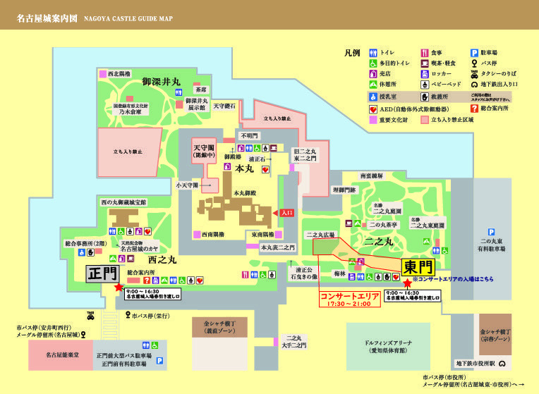 但し、名古屋城天守閣などの場内への入場は午前9時~16時30分までとなっておりますので、コンサート開場時間(17:30~)はコンサートエリアしか立ち入る事が出来ません。